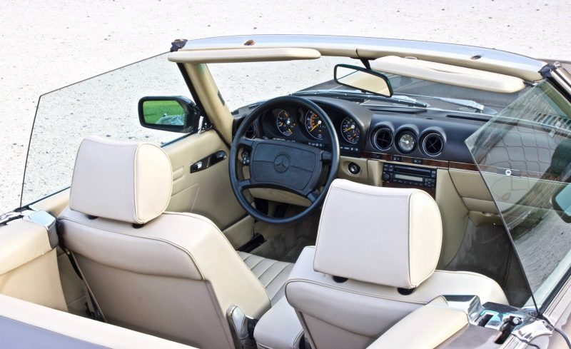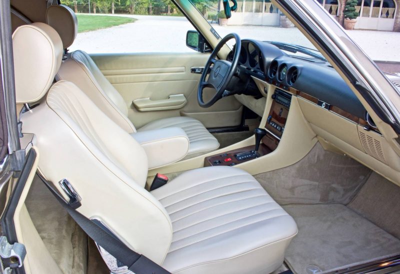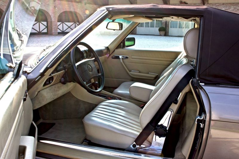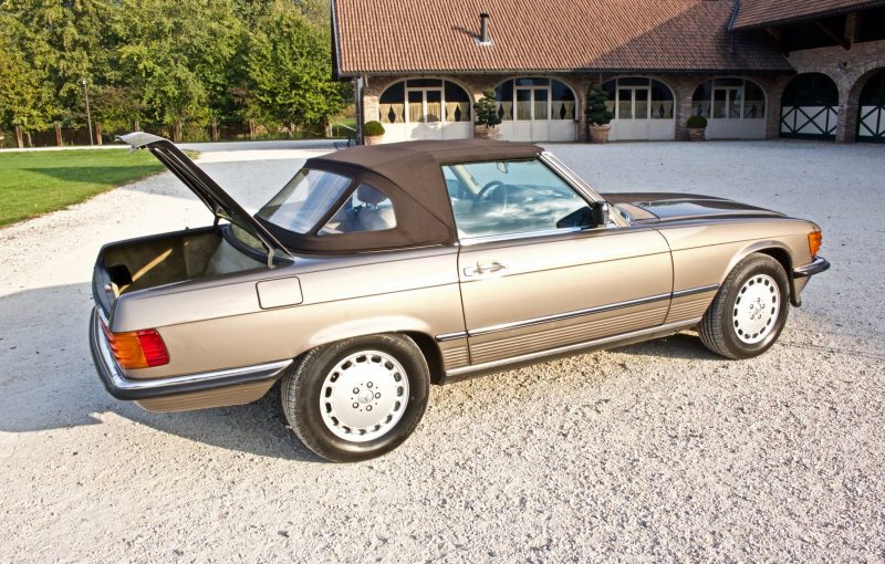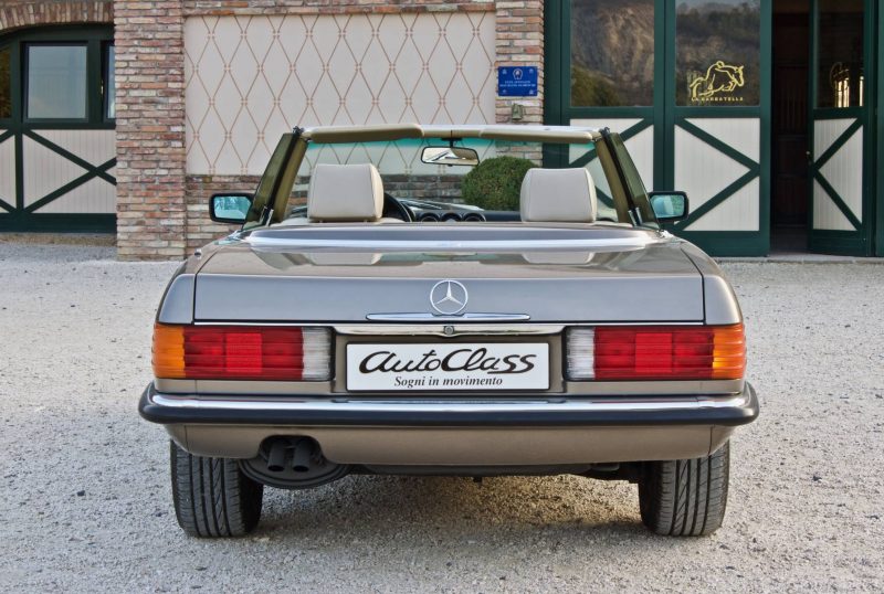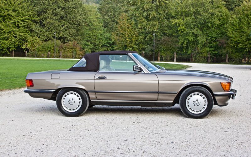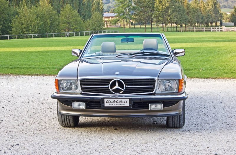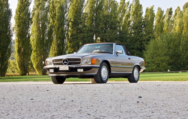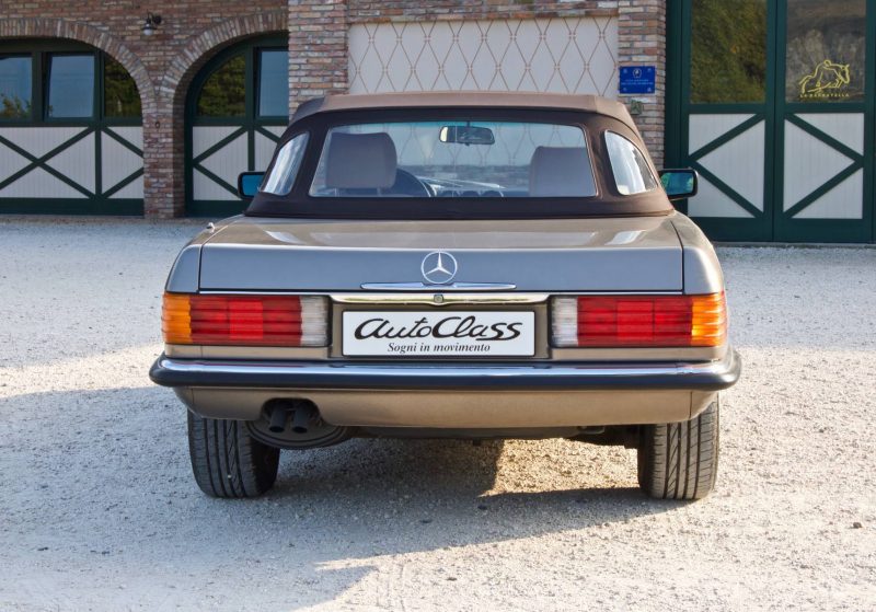 Pur essendo stata commercializzata anche in altri Paesi extraeuropei, tra cui il Giappone e l’Australia, quello statunitense è sempre stato il mercato di riferimento per la Daimler-Benz, specie quando si tratta di commercializzare modelli prestigiosi. La SL della serie R107 non fa eccezione, anzi, i due terzi della produzione totale è stata immatricolata proprio negli States. Le SL R107 previste per il mercato USA si differenziano da quelle europee per alcuni particolari estetici, primo fra tutti quello dei gruppi ottici anteriori sdoppiati in due fari circolari ciascuno. Altra evidente peculiarità sta nei paraurti molto più sporgenti, 203 mm in più per ciascuno, sia anteriormente che posteriormente. Inoltre, si ha fin dall’esordio la presenza del catalizzatore.